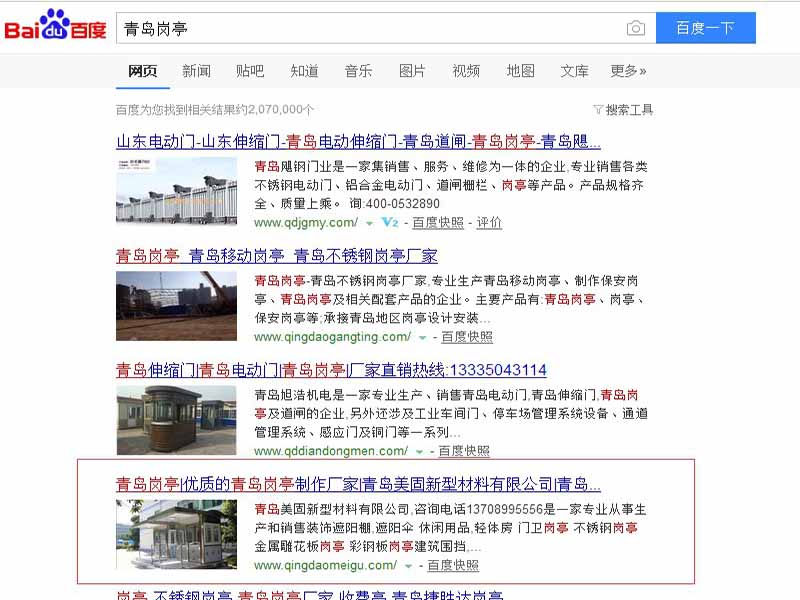 | 2 | 青島崗亭廠家 | 1 | 第一頁 | 2017-6-13 | www.qingdaomeigu.com | 百度 |